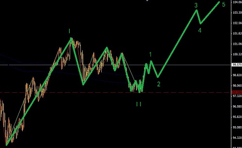 美日在前面看天圖級別沒有調(diào)好,日元走了一段獨立行情然后又沒勁了,美日在形態(tài)上完成了一個C與A等長的內(nèi)部結(jié)構(gòu)為5-3-5的鋸齒型調(diào)整,美元指數(shù)看底,所以這種很尷尬的位置做空難做,對美日非常熟悉的朋友如果你還有空單在2浪的地方最好全部出掉!