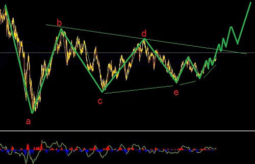 97.6很有可能會(huì)打兩次,前邊一個(gè)97.6在第55小時(shí)后第二次打,然后反彈99.9,假設(shè)市場(chǎng)再打一次97.6被多頭守住,那么目標(biāo)是要直打99.9的,而此種假設(shè)一旦成立,那么昨日晚間的下跌將很可能成為3-2的急速調(diào)整,97.6若能堅(jiān)守,沖破99.4的高點(diǎn),那么波浪里我將并作3-3重疊共振驅(qū)動(dòng)浪。相對(duì)97.8一次就進(jìn)行的急速反彈,97.6更重要